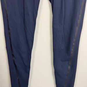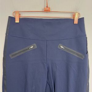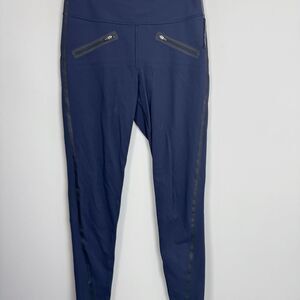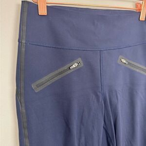 Sleek and comfortable leggings by Spanx. Ideal for gym or casual wear. Features a flattering fit and compression. Navy blue with black accents and zippers. Tech tape is flawed as shown but could be glued or tacked. Women’s size medium.