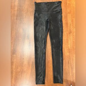 Women's Spanx black semi shiny faux leather leggings. Size medium. The measurements are waist 26", in-seam 27", and rise 9". Material content is 87% nylon & 13% elastane. Easy care, machine wash.