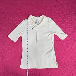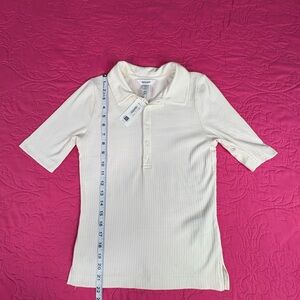 Stylish ivory top with ribbed texture. Features a classic button-up design and collar.