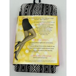 SPANX New Tights Women SZ B 115-150lb Black Shaping Open-Weave Diamond stripe Brand new in box Suggested retail $28. Size B fits 4'10"-5"9" and 115-150 pounds Shapes tummy rear and thighs. Slimming fashion tights are comfortable to boot