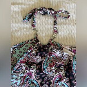 Stylish one-piece swimsuit with paisley print. Halter neck design. Perfect for beach or pool.
