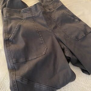 Relevant details: Pull on flat front with elastic back, zippers and elastic at ankles, front slash pockets, back pockets, jogger style, mid rise, ankle length
