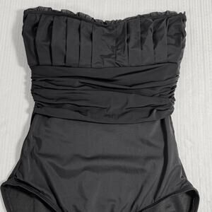 This classic Spanx black one-piece swimsuit combines timeless style with confidence-boosting design. The strapless bandeau neckline features soft pleating and a subtle ruffled edge for an elegant, feminine touch. Horizontal ruching through the midsection helps smooth and shape for a flattering silhouette, while light padding adds support and comfort. A must-have for poolside lounging, tropical vacations, or chic resort getaways. Items come from a smoke-free home.