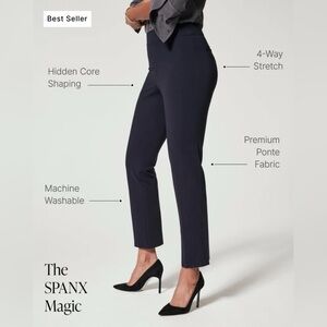 This smoothing pant comes in our premium ponte fabric with targeted compression built in, powered by SPANX CoreSure Tech™. With comfortable 4-way stretch and a high rise waist, this slim straight pant will have you feeling smooth from tummy to thigh, and oh-so-comfortable throughout the leg. No zippers, no buttons, and no pockets (so no bulk!) at the hips—all for the ultimate smoothing effect.