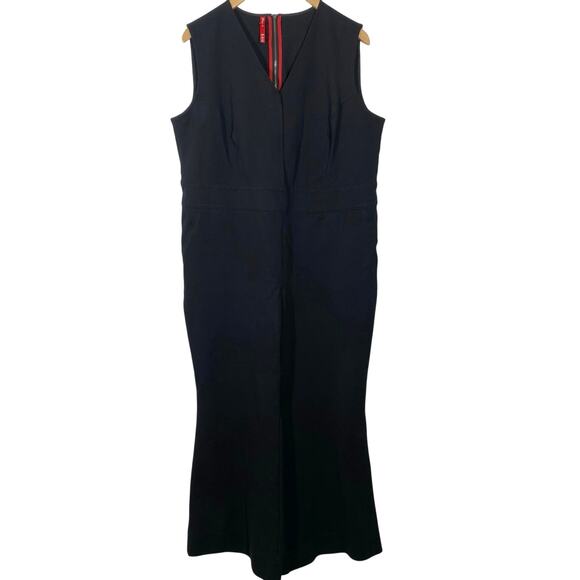 Spanx jumpsuit womens size 1X petite. It features a sleeveless design with a flare leg style and a zip closure. The jumpsuit offers shapewear benefits and has a minimalist style, making it a versatile and stylish option for various occasions