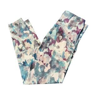 Vibrant crop leggings with a unique abstract pattern in beautiful teal and purple.