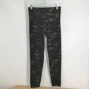 SPANX Look at Me now see less camo green leggings. These are tight leggings, so expect some compression. hits at natural waist for great coverage. Flexible 4 way stretch. Double-layer shaping waistband tames tummy