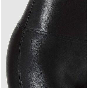 Black faux leather Spanx with a metallic sheen. “Designed with our contoured power waistband, these leggings give you a great butt and flat gut. Our flattering high-gloss fabric is a total compliment magnet and keeps you ultra confident all day and all night.”