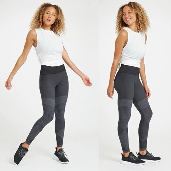Spanx Look At Me Now Moto leggings in very black. Seamless construction. Ankle length. Hits at natural waist. Flexible, 4-way stretch. Double-layer shaping waistband. No center seam. Size XS