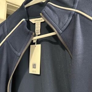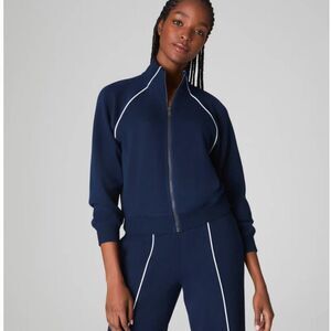 Stylish SPANX jacket in navy blue. Features a zip-up front and white piping detail.