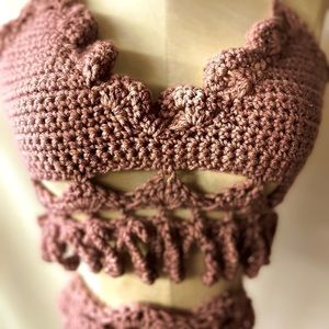 Inspired by our dearly departed, Betty White (Rose on GG) OMG, this bikini is so cute!!! Talk about a bohemian dream, this gorgeous suit has golden strands entwined with the rose gold and it twinkles so beautifully in the sunlight. Daring peek a boo detailing under the bust is very sensual and sexy. Stretchy 100% acrylic yarn was used so this suit will easily fit most anyone between a M and XL.