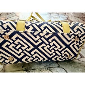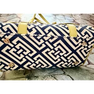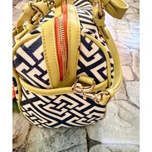 Spartina. 449 Spartina Daufuskie island. Mermaid purse. Excellent condition. Natural linen, genuine leather. Navy and cream with lime gold leather trim. Zipper. Gold mermaid accents and hardware. To handle straps. One adjustable shoulder strap. Approximately 11 length. 10 height. Five width. Three inner pockets. 1 large zipper inner pocket. Zip closure. Extremely well-made purse. Small