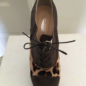 HOT! HOT! HOT! SPAZIO MODA genuine sueded leather stiletto lace-up oxford pump features animal print inset sides; approx. 5" wrapped heel with a lightly padded footbed. Original retail $201. Imported from Italy.