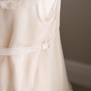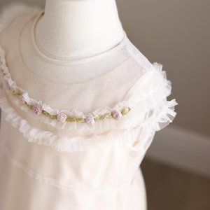 This Little Dress by Designer April Cornell is a BEAUTY!!! The base is done is a beautiful light Apricot and has overlay of delicate mesh tulle done in an Apricot/Blush hue. The top of the dress has a gorgeous oversized collar done in the same tulle and has two rows of tulle ruffles. The top ruffle is adorned with hand-made satin Blush/Rose ribbon roses connected with a light sage green ribbon garland. The back has a key-hole button closure on both layers of the dress with Mother-of-Pearl buttons. A sweet petite tie back sash is held in place on each side by matching Mother-of-Pearl buttons. The bottom of the dress has 6 layers of tulle ruffles. Such a delicate, feminine, sweet little dress! This dress is so Special and I haven't seen another like this design. BEAUTIFUL! Great for Special Occasions, Little Flower girls, Tea Parties, Church, etc. New With Tags!