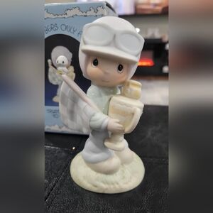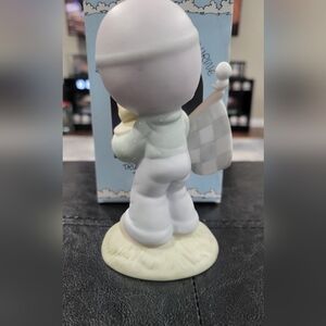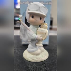 This vintage Precious Moments figurine titled "Trust in the Lord to the Finish" is a must-have for collectors of decorative figurines. This is a 1984 Special Edition for Members Only. It features a boy wearing racing goggles and holding a winner trophy.