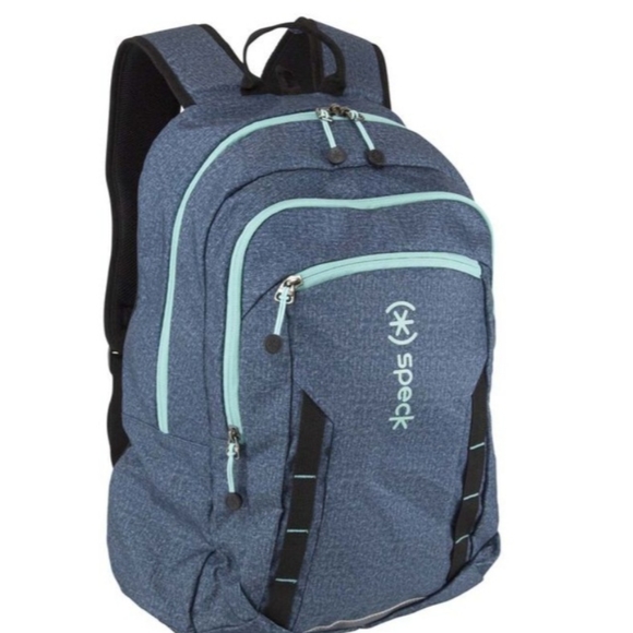 Pre-owned lightly used SPECK brand Prep model backpack. Heathered Grey and Bleached Teal. Fits most laptops 'up to' 15 inches, with a number of other organizational pockets. Great co-ed student model, light weight with lots of room. Actual backpack pictured in outdoor images