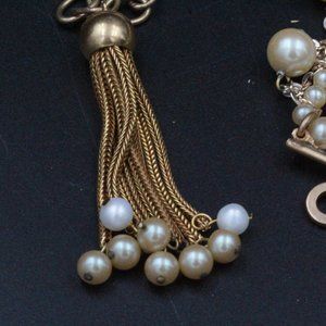 This glorious high end runway beaded belt features champagne color faux pearls with rose gold plated links connecting the beads with a beautiful textured tassels and an S-Hook on each ends. This piece is 26" long and 2 1/3" wide. This is in magnificent condition.