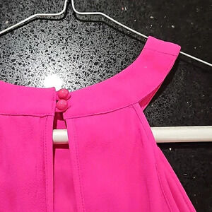 bright fuscha shouderless dress with neck accent and key hole in the back