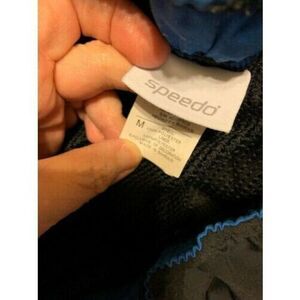 SPEEDO SIZE MEDIUM BLACK SWIM TRUNKS. BLUE TRIM. 21" LONG, 9.5" INSEAM. Good condition.