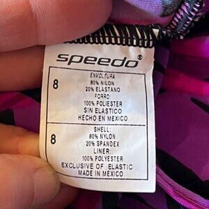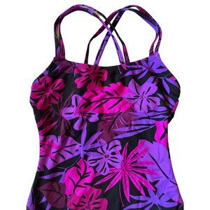 This classic Speedo one piece swimsuit is a nod to the 90s with its high cut, cross back design. The vibrant purple Hawaiian hibiscus print pops against the black background. Fully lined with added padding for comfort. Looks like new.