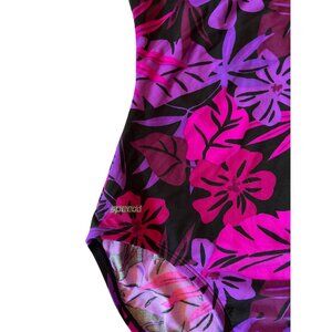 SPEEDO Swimsuit One Piece Hawaiian Hibiscus Floral Print Purple Black High Cut
