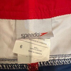 The product is a pair of Speedo women's red lifeguard swim shorts in size 6. These swim shorts are designed for women and feature a classic swim bottom style. Made by the well-known brand Speedo, these swim shorts are perfect for a day at the beach or pool, providing both style and comfort. The vibrant red color adds a fun pop to your swimwear collection, making them a versatile choice for various water activities.
