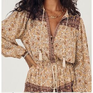 Sundown is Spell's most sustainable collection yet with 100% preferred fibers. This romper is crafted in 100% organic cotton, with lining at the shorts and a comfortable elastic waistband. With striking print placement throughout, billowing sleeves and antique brass buttons at the waist, this romper is a charismatic style with a structured approach.