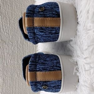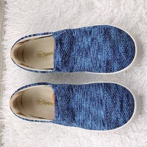 Spenco Women's Coastal Patriot Blue Multicolored Space-Dye Stretch Mesh Upper Low Top Round Toe Slip On Summer Shoes. Non-Slip/Non-Mark Rubber Sole. Support Arch/Heel Suede Leather Footbed. Sole/Footbed Staining Per Pictures. Upper Side Wall Marks. Suede Leather Interior Heel Pad. Size 7.5W