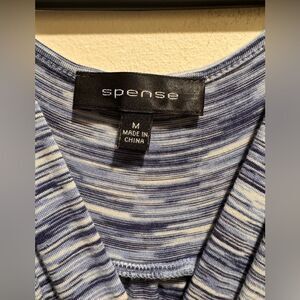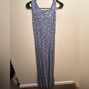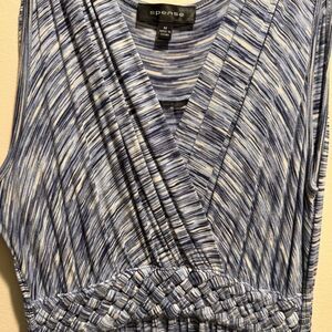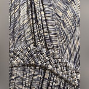 Spense Sleeveless Maxi Dress Size Medium with a Blue & White pattern with a hint of black mixed in Great light weight maxi dress that can be dressed up or down. Has a pretty front with a braided design across the waist & crisscross front v-neckline