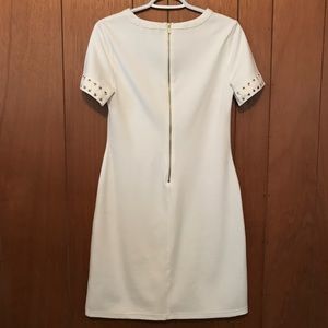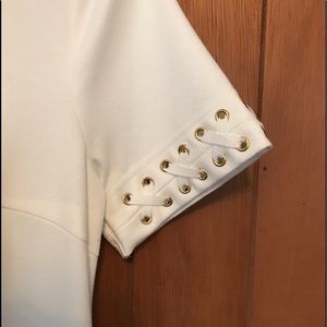 Classic and very comfortable dress with original gold details on the sleeves. Stretching material. Wore once for a photoshoot (perfect for a pregnant lady with a size of 2 :))