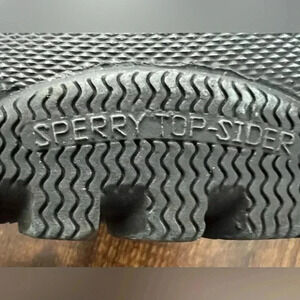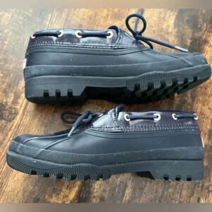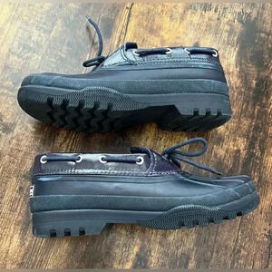 Women’s Sperry Top Sider low profile rubber duck shoe. Metal Sperry grommets. Rubber shoe & sole. Thick, non-marking sole. A few scuffs on shoe (see picture). Waterproof. Good, used condition.