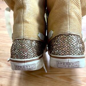 Sperry Top-sider Gold glitter/Sherpa boot. Wear all the way laced up or fold half down.
