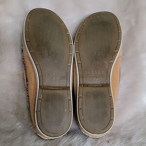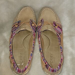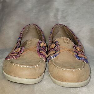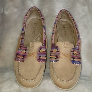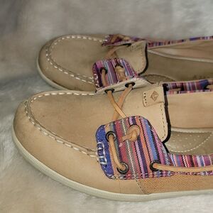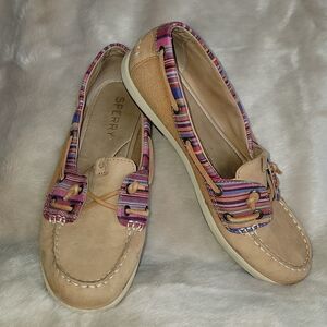 SPERRY TOP-SIDER TAN WITH PINK STRIPES LEATHER BOAT SHOES, SIZE 7.5
