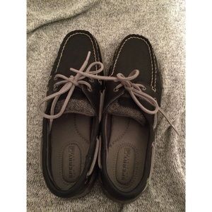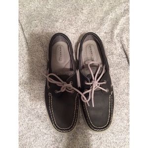 Black and grey sperrys. I've never worn these out once so they are basically BRAND NEW. no scratches or tears nothing!!! If you are SERIOUSLY interested im willing to drop the price.