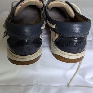 Classic laced topsider in very supple navy leather with a cute red/white/blue anchor fabric trim (this is dirty on edge).