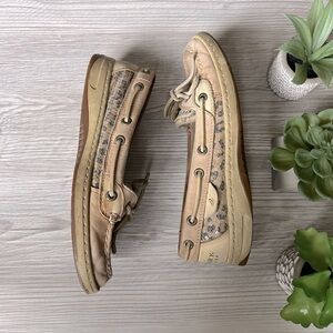 Sperry Angelfish boat shoes. Animal print and sequin accent. Slip on style. Memory foam footbed. Hand-sewn construction with padded tongue. Genuine all leather upper. EVA molded midsole provides support and comfort. Color tan and brown. Tan laces. Adjustable 360° lacing system ensures a secure fit. Wet/dry traction with non-marking rubber outsoles. Sperry sailboat symbol on each side. Womens size 6.5. Signs of wear, please review all photos. No shoebox included.