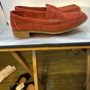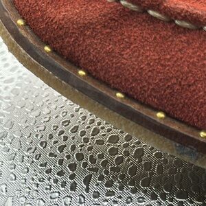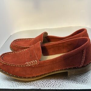 SPERRY burgundy flat suede shoes. They’re very cute. They have little gold studs all around the outside of the shoe which I have photographed. Size 8. An excellent use condition.