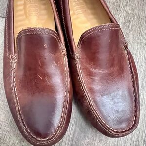 PREOWNED brown leather slip-on loafers feature a moccasin-style construction with decorative stitching around the top. The shoes have a smooth, polished finish and a rounded toe, offering a classic and elegant look. The interior is lined with a light tan leather, ensuring comfort with every step.