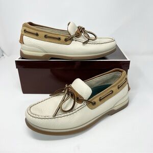 Classic boat shoes in original cream leather with brown rawhide laces. Signature razor-cut wave- siping technology for the ultimate wet/dry traction. Wear them all day comfortably all day without skimping on the style. Eva cushioning ensures all-day comfort. Shoes are in excellent condition, preowned with minimal signs of wear. Smoke free home!