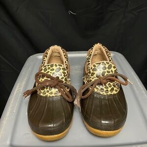 Size 6. Low cut rubber boot with animal print. Dark brown rubber upper with light and dark brown animal print. Laces will need changed since they are frayed at the ends. Good used condition.