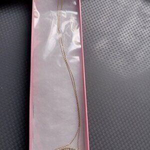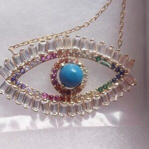New in original cellophane wrap with pink gift box provided. Gold plated, sterling silver, 17 inch with extender, cubic zirconia stones, and a synthetic turquoise bead. Rainbow of colors. Very pretty. Calmness. Clarity.