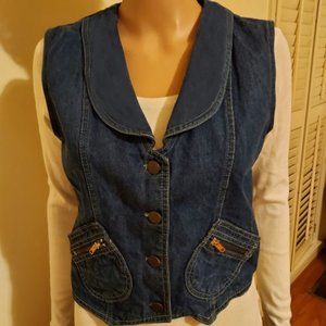DESCRIPTION: BEAUTIFUL VINTAGE FRONT COLLAR DENIM VEST WITH ZIP FRONT POCKETS AND BUTTON CLOSURE