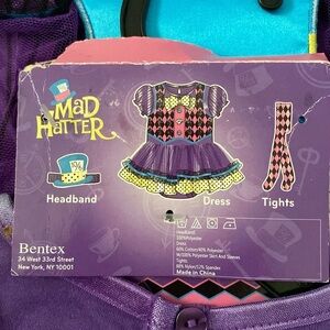 SPIRIT Mad Hatter halloween costume purple yellow pink blue black sparkly 3-piece dress set. Includes dress with attached snap bottoms, hat headband, and tights. Vibrant colors for a whimsical look.