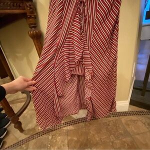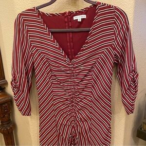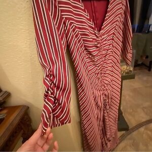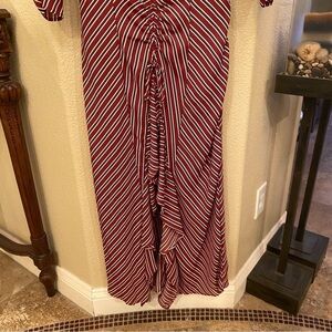 Pre-owned in great condition with no rips or stains but back of zipper has some loose threading as shown in pictures but not too noticeable. Women’s beautiful maroon striped maxi dress with ruching and ruffles on the front. 3/4 sleeves with ruching. Zipper on the back. Has lining inside. Comes from smoke and pet free home.