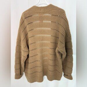 Snuggle up after your workout in this camel open-front cardigan knit in an airy open-stitch pattern from a soft merino-wool yarn blend.