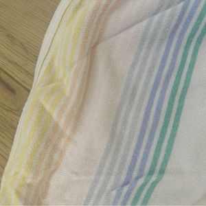 Cozy white with rainbow lines down the sides of arms and legs. This is a must have item for travel, sleep, or hanging around the house!