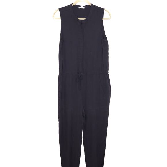 SPLENDID Brook Sleeveless Jumpsuit Elastic Waist Tencel Blend in Black Women's M. This easy-to-style Splendid jumpsuit is made even more warm-weather ready by its viscose-tencel fabrication. Crew neckline. Pockets. Hidden front button down placket. Elastic waistband with drawstring.