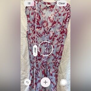 Stylish jumpsuit with a pink and white pattern. Features a cinched waist for a flattering fit.