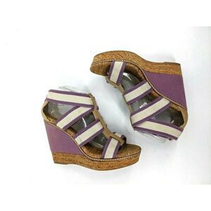 Splendid Elastic Straps with Purple and beige fabric. Women's size 10 US. Cork and Purple fabric wedge platfrom open toe sandals. Good pre-owned conditon. No rips or holes. Thin pen mark on back of fabric...There is a thin fabric nylonish material on the soles. Some where on heels of fabric..looks like some one reglued the front foot bed on front of one shoe..see photos. Comes from smoke free environment.
