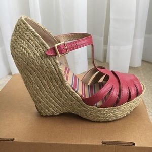 All leather outer and insole. Raffia wrapped 5” heel and 2” platform. Cushioned leather insole. Strappy front with adjustable ankle strap. True to size. 8M. Gently worn and in excellent condition.